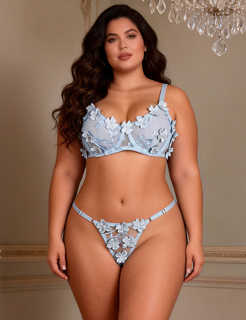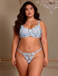 Home > Plus Size Bra Wholesale > Blue Sexy Floral Mesh Embroidery Lace Bra Set