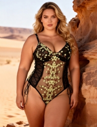 Product Name Fashion Embroidery Black Mesh Plus Size Bodysuit With Underwire