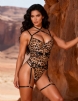 Main keywords: leopard print, printed mesh, underwire, clasp, multiple adjustable straps, bondage.