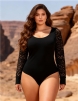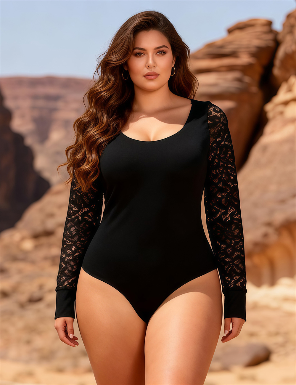 Home > Plus Size Teddy Supplier > Black Sexy Swim Cloth Lace Sleeves Round Neck Open Crotch Bodysuit